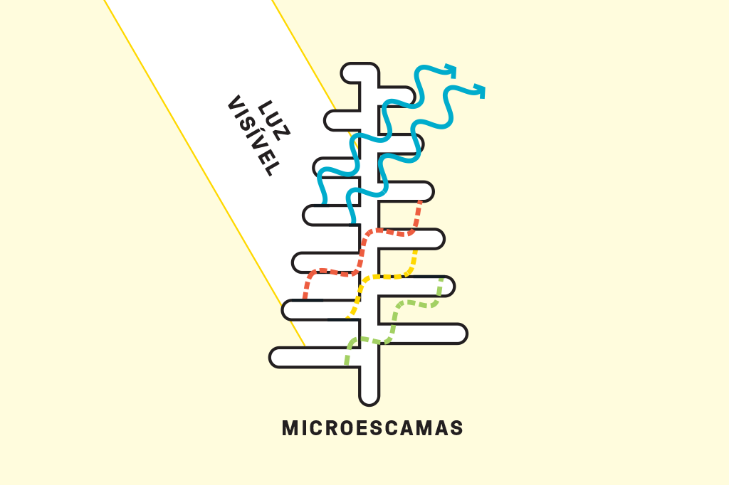 Em contato com a luz branca, as microescamas alinhadas que formam as asas de espécies como a Morpho didius atuam como lentes. Elas anulam todas as frequências de onda visíveis, menos as do azul.