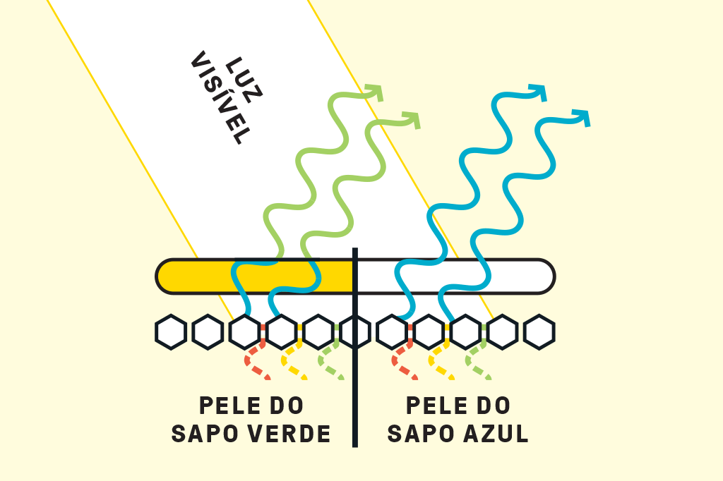 A superfície da pele geralmente tem pigmentação amarela. A segunda camada refrata o azul, que, ao interagir com o amarelo, resulta em verde – na falta de pigmentos amarelos, a espécie fica azul.