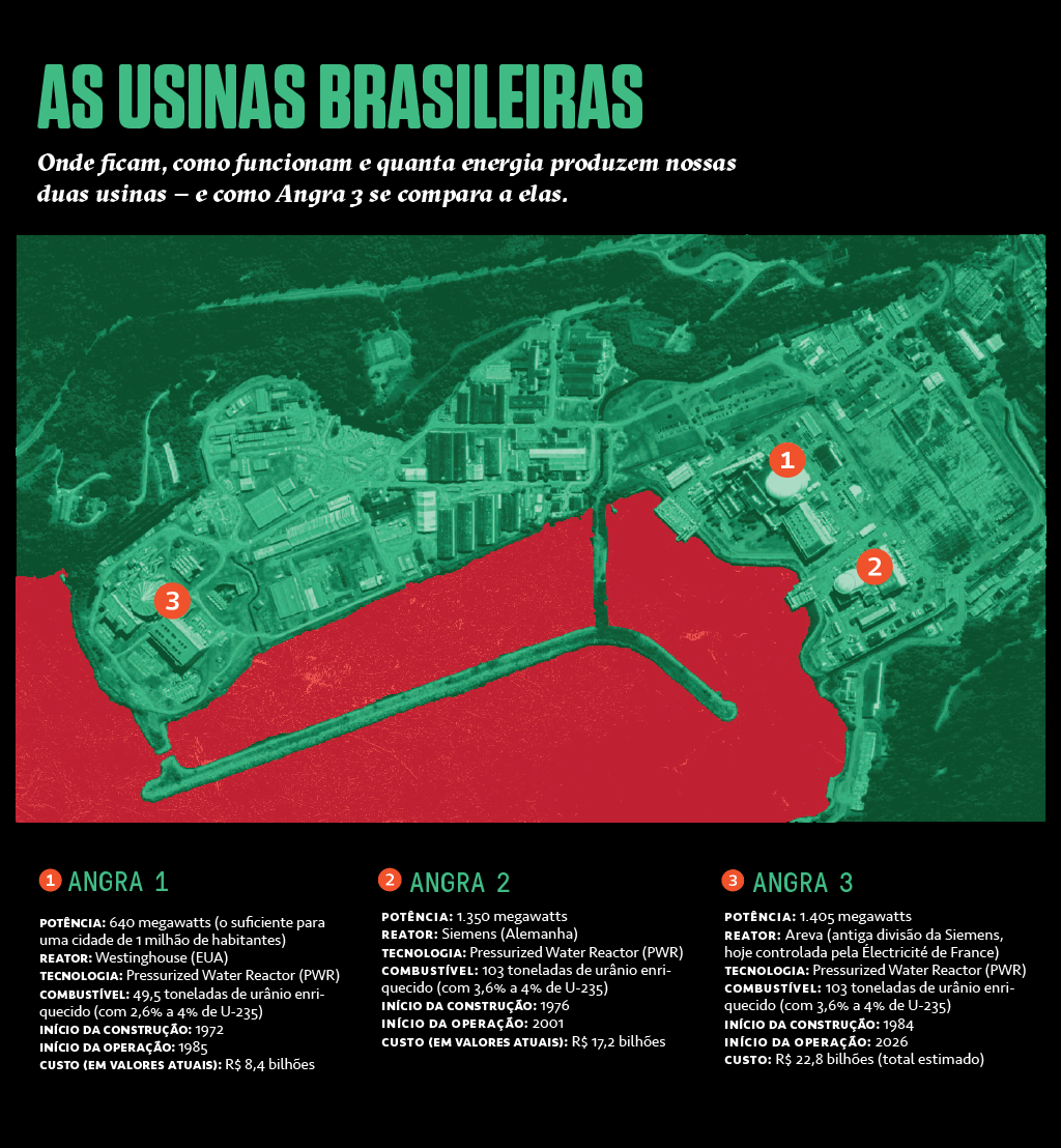A promessa de Angra 3 é outra, não menos importante: soberania tecnológica. A nova usina pode gerar desenvolvimento científico, econômico e industrial, e nos preparar para um futuro menos dependente de combustíveis fósseis (que hoje são 16% da matriz energética brasileira). Inclusive porque o país é um dos poucos a dominar todo o ciclo do urânio – e possui uma das maiores reservas mundiais desse metal.