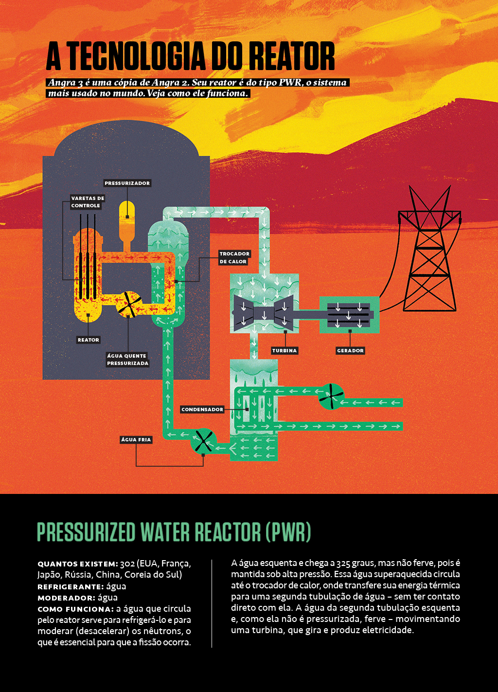 “Esse tipo de reator é o mais utilizado no mundo e de funcionamento relativamente simples, quando comparado com outros modelos”, explica o físico Ítalo Curcio, professor da Universidade Presbiteriana Mackenzie. Em um reator PWR, a água não chega a ferver. Como ela está sob pressão, continua líquida, circula por uma tubulação e troca calor com um segundo circuito de água, separado, que vira vapor e move uma turbina [veja infográfico abaixo].