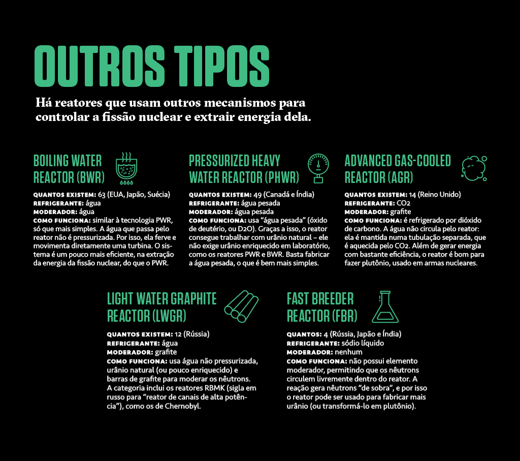 Nos anos seguintes, os EUA construíram vários reatores nucleares, mas seu objetivo não era gerar eletricidade, e sim fabricar plutônio (que é feito irradiando o urânio com nêutrons) para usar em bombas atômicas. A bomba de Hiroshima, detonada em 1945, era feita de urânio; a de Nagasaki, lançada três dias depois, usava plutônio.
