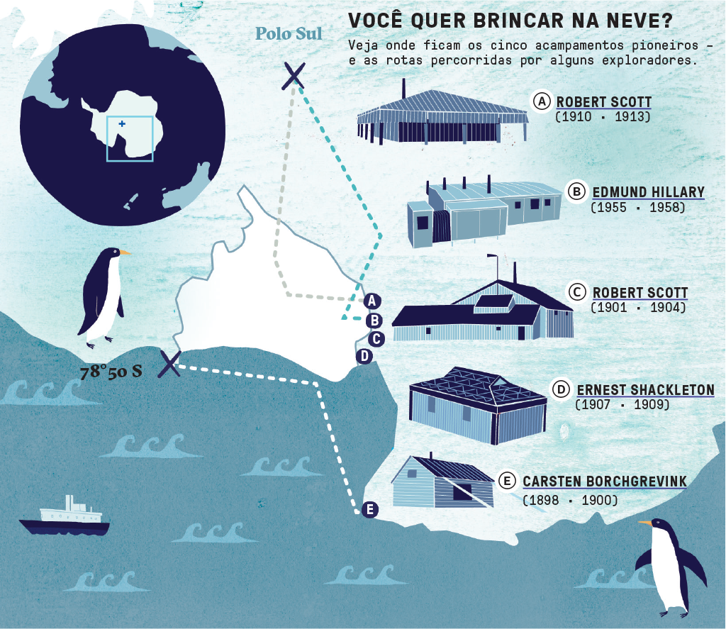 Fontes: Antartic Heritage Trust (AHT); Exploring Polar Frontiers: A Historical Encyclopedia, Vol. 1, de William J. Mills; First on the Antarctic Continent, de Carsten E. Borchgrevink.