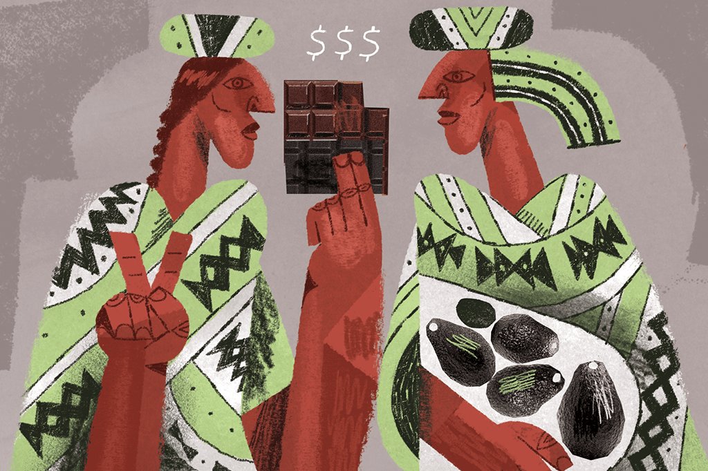 A arte da época já revela uma preferência particular dos nativos pelo cacau, que era transformado em um caldo servido em copos de barro. Esse chocolate quente primitivo já era sinal de status – e, segundo murais do século 7, podia ser trocado por outros produtos básicos, como massa à base de milho. Mas a importância do chocolate – ou pelo menos do fruto que lhe dá origem, o cacau – teria ido além do escambo. Ele pode ter dado origem a um sistema monetário mais complexo.