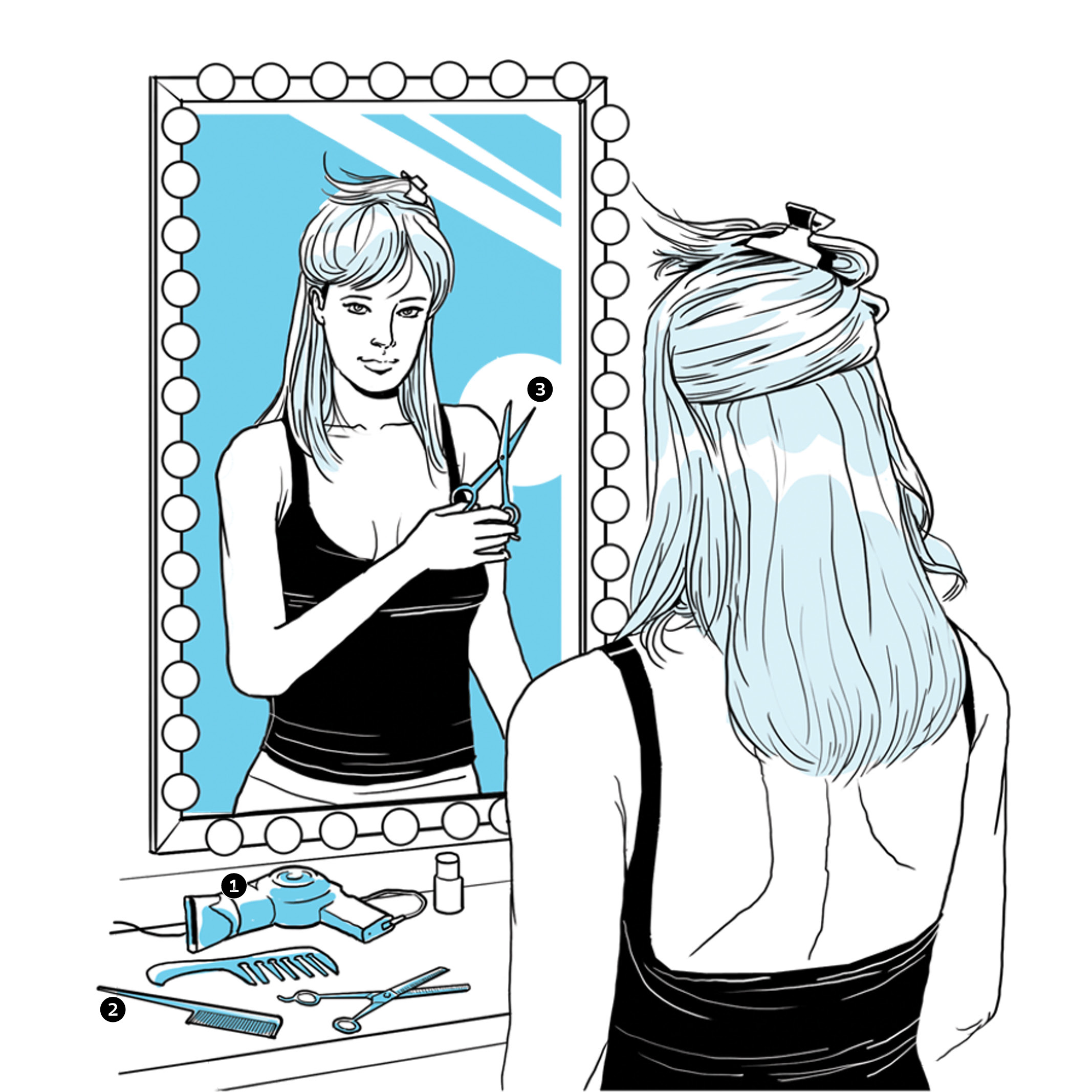 Tesouras com uma das lâminas serrilhada facilitam o alinhamento dos fios e são as mais indicadas para os iniciantes. Já as de fio navalha deixam o cabelo esvoaçante e mais natural – mas as lâminas são afiadas e muito sensíveis ao toque. Se você não tem medo de ser feliz, pode tentar usar a navalha (mas só se tiver cabelo liso – nos cacheados o risco de o corte ficar sem forma é bem grande).