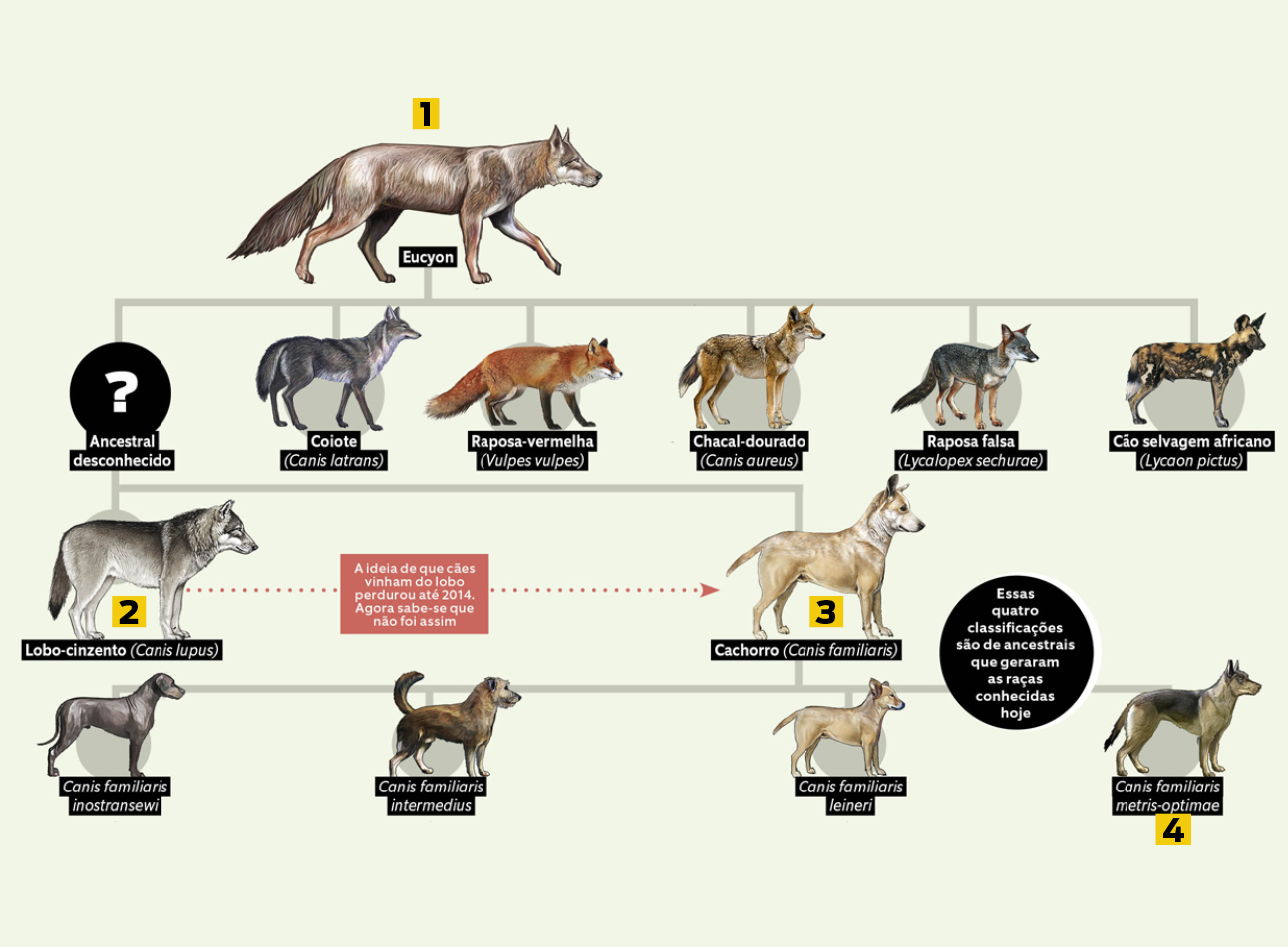 Não, ele não veio do lobo! Confira o cladograma do Canis familiaris e saiba como uma criatura pré-histórica virou seu melhor amigo. Mas atenção: a árvore evolutiva dos cachorros ainda é muito inexata. Este fluxograma reúne informações de diversas pesquisas, que nem sempre concordam uma com a outra.