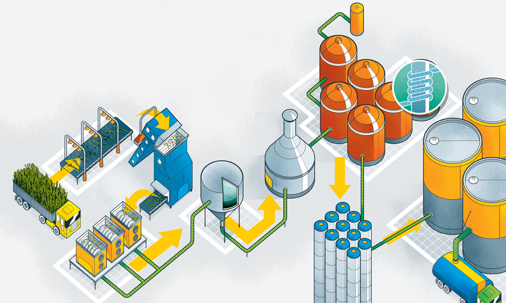 1) A maior matéria-prima do etanol brasileiro é a cana-de-açúcar. Ela chega às usinas em caminhões e é descarregada em esteiras rolantes. A primeira etapa da produção é a lavagem da cana, que recebe um banho de água que retira terra, areia e outras impurezas