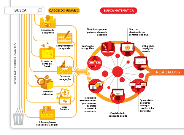 Simples: ele pesquisa o usuário antes de efetuar a busca solicitada. Contanto que você esteja logado a uma conta do Google, seus sites favoritos, os compromissos marcados na sua agenda, e-mails trocados, sua localização geográfica e até o seu perfil nas redes sociais (Google+) serão considerados para criar uma busca personalizada e apresentar resultados mais próximos daquilo que você deseja. Se você buscar por “restaurante japonês”, por exemplo, ele vai usar a sua localização geográfica para que os primeiros resultados sejam de restaurantes perto de você.
