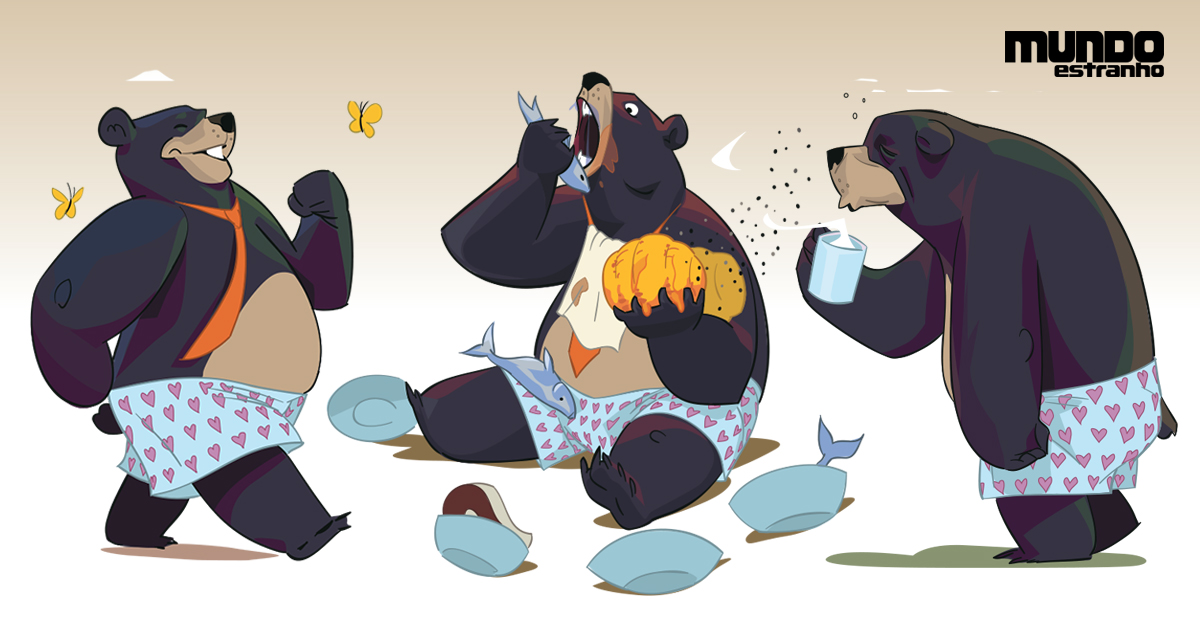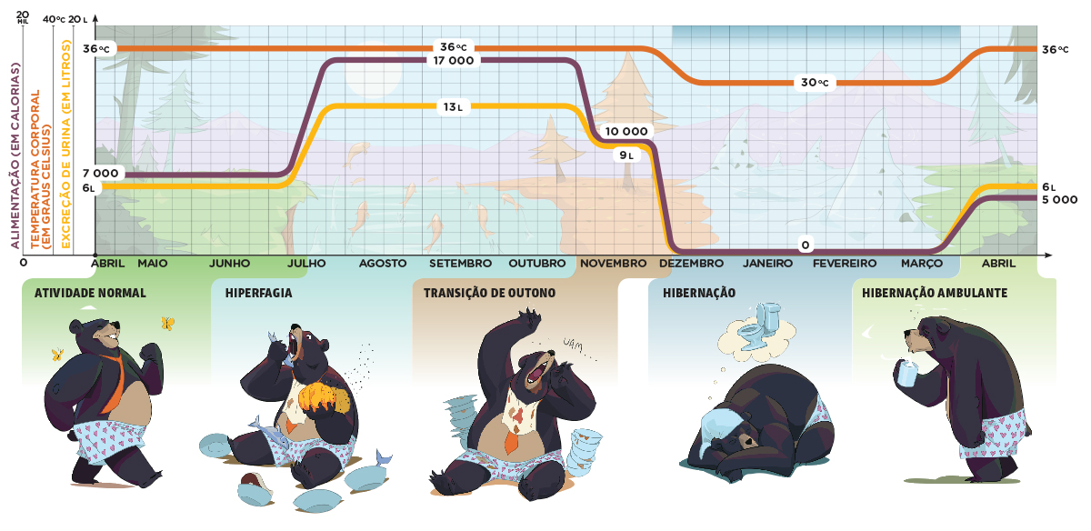 Para enfrentar o frio e a escassez de alimentos do inverno do hemisfério norte, eles tiram o time de campo, passando um tempo sem beber, comer, urinar e defecar. No caso dos ursos-negros, esse período varia entre cinco e sete meses por ano. Segundo uma pesquisa da Universidade do Alasca divulgada em fevereiro, o metabolismo dessa espécie fica reduzido a 25% de sua capacidade, a temperatura do corpo baixa em média 6 ºC e a frequência cardíaca cai de 55 para só nove batimentos por minuto! A queima da gordura estocada no corpo libera a água e as poucas calorias de que ele necessita para sobreviver. Também acontece uma reciclagem de componentes nitrosos, como a ureia. Combinados com a glicerina resultante do uso da gordura, esses dejetos formam aminoácidos que ajudam a manter as proteínas corporais.