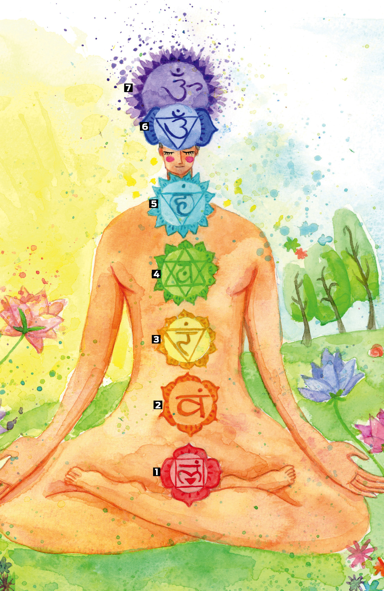 Segundo religiões orientais, como o hinduísmo e o budismo, são centros de energia que regem a nossa estabilidade física, intelectual, emocional e espiritual. A palavra chakra vem do sânscrito e significa “roda”, pois se acredita que eles são vórtices que não param de girar, agindo como antenas, recebendo e emitindo sinais de energia vital em pontos específicos do nosso corpo. Quando um chakra está desequilibrado, afeta os órgãos ao seu redor. O registro mais antigo dos chakras é proveniente dos Vedas, as escrituras sagradas do hinduísmo, que surgiram no século 2 a.C. Porém, essa crença se popularizou de tal maneira que ultrapassou as barreiras da cultura hindu, atingindo outras tantas, inclusive ocidentais. Segundo os hindus, os chakras se encontram e fundem nas Nadis, que são caminhos invisíveis dentro do nosso organismo, funcionando como canais condutores por onde circula a nossa energia vital. Cada chakra influencia uma ou mais áreas específicas da nossa personalidade e saúde. Algumas passagens do Vedas falam que existem 32 chakras, e outras até 88 mil, mas a maioria concorda sobre a existência dos sete principais, que percorrem toda a nossa coluna vertebral.