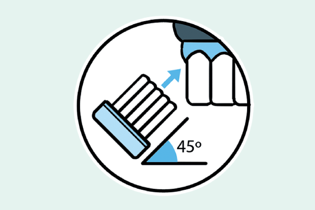 Apoie as cerdas num ângulo de 45˚ na junção entre a gengiva e os dentes. Os movimentos devem ser circulares e suaves para não agredir a gengiva. Jamais escove no sentido dente-gengiva para evitar retração gengival, que no longo prazo pode evoluir até para a queda dos dentes.