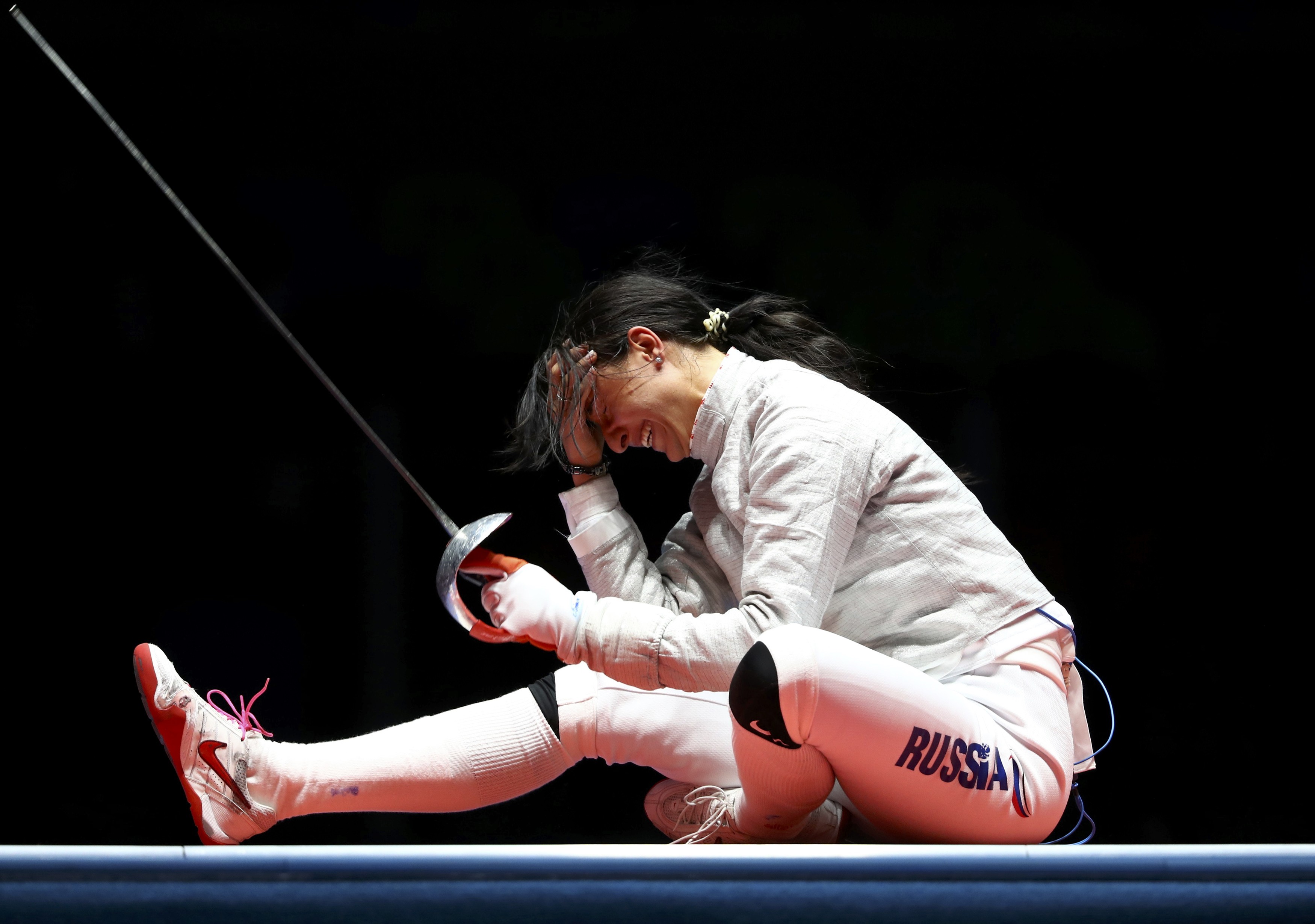 8/9 Sofya Velikaya era a favorita na final entre as esgrimistas russas. Aos 31 anos, ela já havia faturado prata nos jogos de Londres, em 2012, e começou melhor a luta: abriu quatro pontos de vantagem. A jovem Yana Egorian (na foto), de 22 anos, correu atrás e empatou o jogo. Ainda assim, Velikaya esteve quase sempre a frente e chegou a ter o ponto do jogo nas mãos. Com apenas um ponto a menos, Yana Egorian se adiantou aos golpes, virou o jogo e levou o ouro. Desabou emocionada no chão. ()