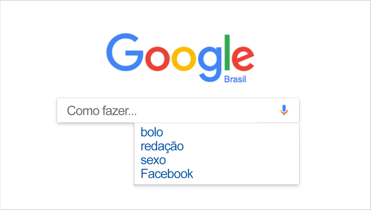 Jogamos “como fazer…” no Google Trends para ver qual é a habilidade que está em falta em cada Estado brasileiro. Rondônia, Maranhão, Mato Grosso do Sul, Piauí e Rio Grande do Norte consultam o Google para aprender a fazer bolo. Amapá, Roraima e Acre têm dúvidas de como se escreve uma boa redação. Tocantins quer mesmo saber o que importa: fazer sexo. E o resto do Brasil só quer brilhar muito nas redes sociais, mas não sabe como – precisa de ajuda para criar uma conta no Facebook. Isso mesmo. As pessoas vão ao Google para perguntar como se cria um perfil em seu maior concorrente, o Facebook.