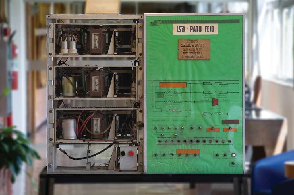 Texto Luiza Lopes | Design e fotos Juliana Krauss | Edição Rafael BattagliaA manhã de 24 de julho de 1972 começou atípica nos corredores da Escola Politécnica da USP. Professores e alunos da engenharia elétrica se apressavam para reorganizar uma sala de aula. Tiraram carteiras, desmontaram o tablado e estenderam um tapete emprestado da diretoria para esconder o piso gasto.Do lado de fora, autoridades começavam a chegar. O então governador de São Paulo, Laudo Natel, o reitor da USP, Miguel Reale, e o bispo Dom Ernesto de Paula compunham a pequena comitiva que testemunharia um marco: a exibição pública do Patinho Feio, o primeiro computador construído no País.Pouco antes do início da demonstração, a cena foi interrompida de forma abrupta. Um repórter, ao tentar fotografar a máquina de perto, inclinou-se além do necessário, tropeçou em um dos cabos e desligou o computador diante de todos.O silêncio que se seguiu denunciou o tamanho do problema. Naquele equipamento, nada permanecia salvo. Diferentemente dos computadores de hoje, que mantêm arquivos mesmo quando desligados, o Patinho Feio perdia tudo assim que a energia caía. Como cada instrução havia sido carregada manualmente para a apresentação, todo o conteúdo desapareceu no mesmo instante.A solução teve de ser construída ali mesmo. Um dos estudantes começou a repetir para o colega, ponto a ponto, as instruções preparadas. Diante do painel, outro aluno reintroduziu cada etapa manualmente, usando os pequenos interruptores da máquina.Só então o computador pôde ser religado. O material da demonstração foi colocado no equipamento de impressão, e a máquina respondeu com o desenho de um pato feito de vários “X”, seguido da frase que se tornaria emblemática: “Eu sou o Patinho Feio”.Primeiros passosO Patinho Feio surgiu num momento em que os computadores, mesmo ainda restritos a grandes instituições, já sinalizavam uma mudança radical na forma como a sociedade funcionava. “Dava para sentir que era um ponto de inflexão do caminhar da existência humana”, afirma José Sidnei Colombo Martini, professor titular da Poli e um dos criadores da máquina.Para o Brasil, entender essa transformação e participar ativamente dela era fundamental.A necessidade de inovação coincidiu com as políticas protecionistas do regime militar, que passou a enxergar a informática como uma frente essencial em seu plano para o País. Computadores já eram usados em áreas como defesa e comunicação, e o governo temia depender apenas de máquinas importadas. Se tudo continuasse vindo de fora, o Brasil não aprenderia a projetar seus próprios sistemas e ficaria vulnerável a qualquer mudança no mercado externo.O protecionismo militar se apoiava em duas frentes. A primeira era fortalecer universidades em temas como eletrônica digital e arquitetura de computadores. A segunda era a reserva de mercado, que restringia a entrada de equipamentos estrangeiros e forçava empresas nacionais a produzir seus próprios modelos.Dentro da Poli, essa política encontrou terreno fértil. Em 1968, o professor Antônio Hélio Guerra Vieira criou o Laboratório de Sistemas Digitais (LSD), hoje chamado de Departamento de Engenharia de Computação e Sistemas Digitais (PCS).O próximo passo foi a contratação de Glen Langdon, funcionário licenciado da gigante americana de tecnologia IBM. Ele ministrou uma disciplina na pós-graduação intitulada “Projetos de Sistemas Digitais”, cujo trabalho final dos alunos era projetar uma máquina do zero.A proposta chamou a atenção da direção da escola: havia ali algo que ultrapassava o caráter acadêmico e podia ganhar forma concreta. O diretor Oswaldo Fadigas, então, passou a buscar recursos para que a ideia deixasse o papel e se tornasse um protótipo real.Paralelamente, a Marinha do Brasil avaliava formas de equipar navios com tecnologia nacional. A instituição buscava projetos universitários que pudessem receber financiamento. O grupo da Poli se encaixou nessa iniciativa e passou a ganhar repasses regulares para continuar o desenvolvimento da máquina.“Foi o período mais fácil para a gente ter verba”, conta Edith Ranzini, professora sênior da Poli e responsável pela memória do computador. “Geralmente, quando você está fazendo um projeto, precisa prestar contas, esperar aprovarem para então vir a próxima parcela. Eles [a Marinha], de três em três meses, perguntavam: ‘De quanto vocês vão precisar nos próximos meses?’.”Outras universidades seguiram o mesmo caminho. A Unicamp respondeu ao desafio com o projeto “Cisne Branco”.O nome gerou brincadeiras na Poli. Ora, se Campinas tinha um cisne, como deveria se chamar o computador paulistano? Em uma reunião no laboratório, Paulo Patullo, engenheiro formado pela Poli e membro da equipe, sugeriu “Patinho Feio”, e o nome pegou.Feito do zero (e um)O Patinho Feio é bem simples para os padrões atuais. A máquina tem apenas 4 kilobytes de memória. Para comparação, em um celular comum são 80 gigabytes, mais de 20 milhões de vezes essa capacidade. A criação da Poli pesa 60 quilos, tem 1 metro de comprimento e 1 metro de altura. Ocupa o espaço de dois frigobares.Era um computador experimental, pensado para acelerar cálculos científicos. “Ele executava cada operação em cerca de dois microssegundos”, lembra Edson Fregni, professor da Poli desde 1971 e responsável pela arquitetura eletrônica da máquina. Hoje, em comparação, equipamentos modernos fazem o mesmo em bilionésimos de segundo.Para entender como o Patinho funcionava, vamos exemplificar com uma tarefa simples: somar 5 com 8. Anes de iniciar qualquer cálculo, o operador da máquina tinha de preparar os dados. Cada número precisava ser convertido para código binário. Nesse caso, o 5 vira 101 e o 8, 1000. A própria operação de soma também tinha seucódigo específico.Nada podia ser digitado diretamente, porque o Patin